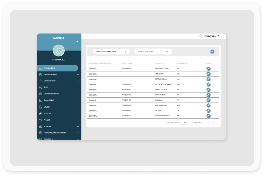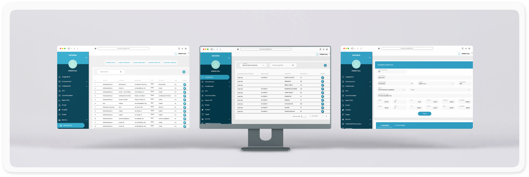 Il gestionale realizzato per il Gruppo Novaria permette il controllo e il monitoraggio delle pratiche dei finanziamenti.  A partire da una gestione oculata delle anagrafiche aziendali e dei soci, vengono create e monitorate le pratiche relative a possibili finanziamenti per scopi di investimento, liquidità e linee di credito varie.